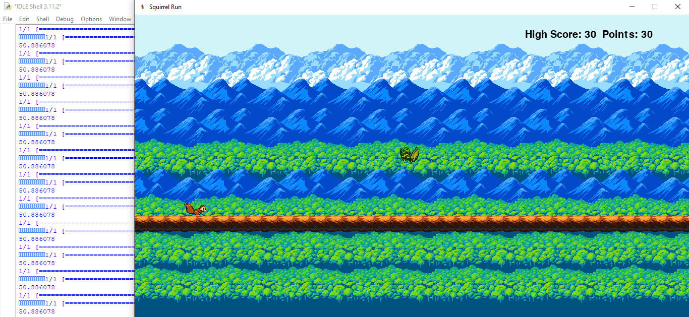 Proyecto basado en el dinosaurio de google. Es una ardilla que corre sobre una plataforma, saltando o agachando obstaculos. La particularidad del proyecto es que es controlado por inteligencia arificial. Creado con TensorFlow y Numpy librerias de Python.